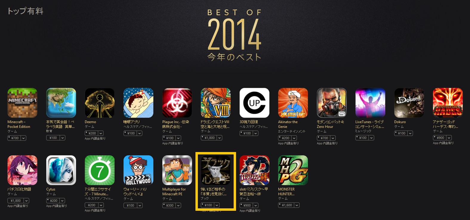 株式会社オープンアップス(所在地:東京都渋谷区、代表取締役社長:加藤秀樹)がiPhone,iPad電子書籍アプリとして開発販売を行った『怖いほど相手の「本質」を見抜くブラック心理学』が2014年12月9日(火)付で、AppStore 有料カテゴリにおいて、2014年のベストアプリに選ばれたことを発表しました。