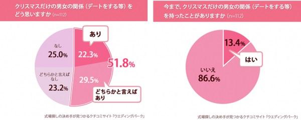 調査結果では『クリスマスだけの男女の関係(デートをする等)をどう思いますか(単一選択)』という質問に、女性の2人に1人以上が「あり」または「どちらかと言えばあり」と回答し、また「今まで、クリスマスだけの男女の関係(デートをする等)を持ったことがある」と回答した女性が13%以上いる事がわかりました。