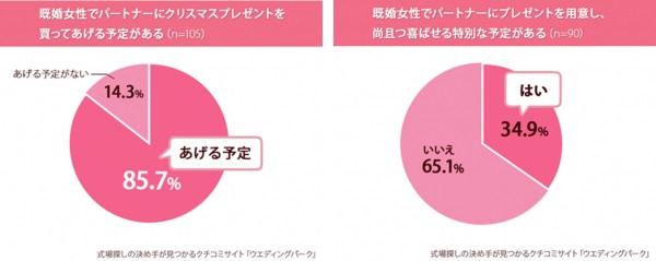 『クリスマスプレゼントの予算を教えてください(単一選択)』という質問をしたところ、5千円未満~3万円以上の予算内で「パートナーの為にクリスマスプレゼントを購入する予定がある」と回答した既婚女性は約9割となりました。そのうちの3割以上の既婚女性が『パートナーを喜ばせるために特別な事をする予定がありますか(単一選択)』という質問に「はい」と回答し、結婚後もクリスマスにパートナーを喜ばせる準備をしている女性が多くいる事がわかりました。