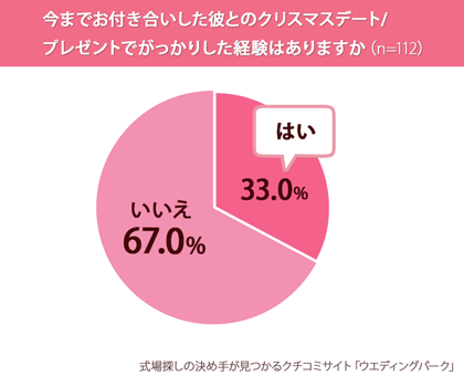 同調査にて20代~30代の女性に『今までお付き合いした彼とのクリスマスデート/プレゼントでがっかりした経験はありますか(単一選択)』と質問したところ、「がっかりした事がある(33.0%)」、「がっかりした事は無い(67.0%)」となり、20代~30代女性の3人に1人が、彼とのクリスマスデートやプレゼントにガッカリした経験がある事がわかりました。