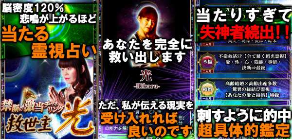 【救世主 光】が、電話占いで発揮してきた驚愕的中力の霊視・霊感鑑定を、WEB占いで体感できます。あなたの生年月日、お名前、まとっているオーラから「魂の波動」を感じとり、あなたやあなたをとりまく人、ものを完全透視します。