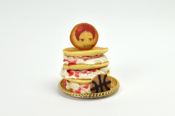 “赤フェス”期間限定メニューとして、人気の「プリント入りラングドシャクッキー」を添えた、3段重ねのパンケーキをご用意いたしました。パンケーキにサンドされている生クリームとストロベリー&オレンジソースは赤司の瞳をイメージしております。