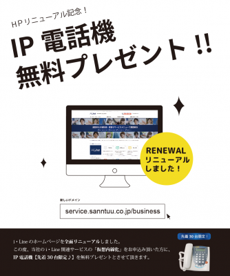 株式会社三通テレコムサービス(以下三通テレコム)は、2015年1月14日(水曜日)にi・Lineのホームページを全面リニューアルしました。この度、当社のi・Line関連サービスの「仮想内線化」をお申込み頂いた方に、IP電話機【先着30台限定♪】を無料プレゼントとさせて頂きます。