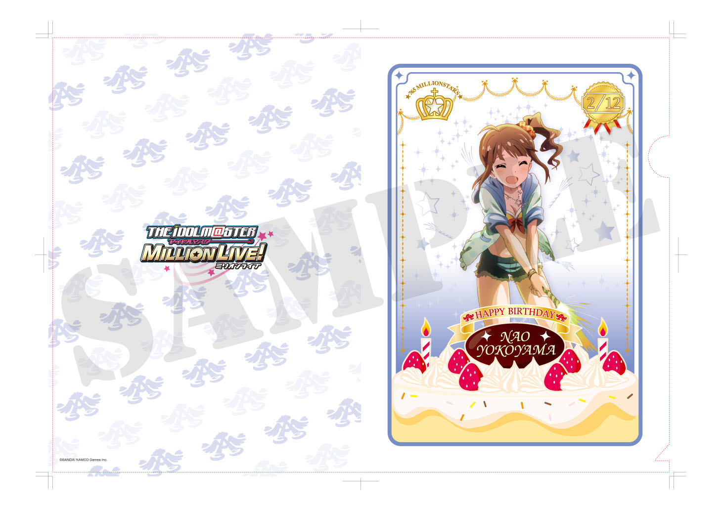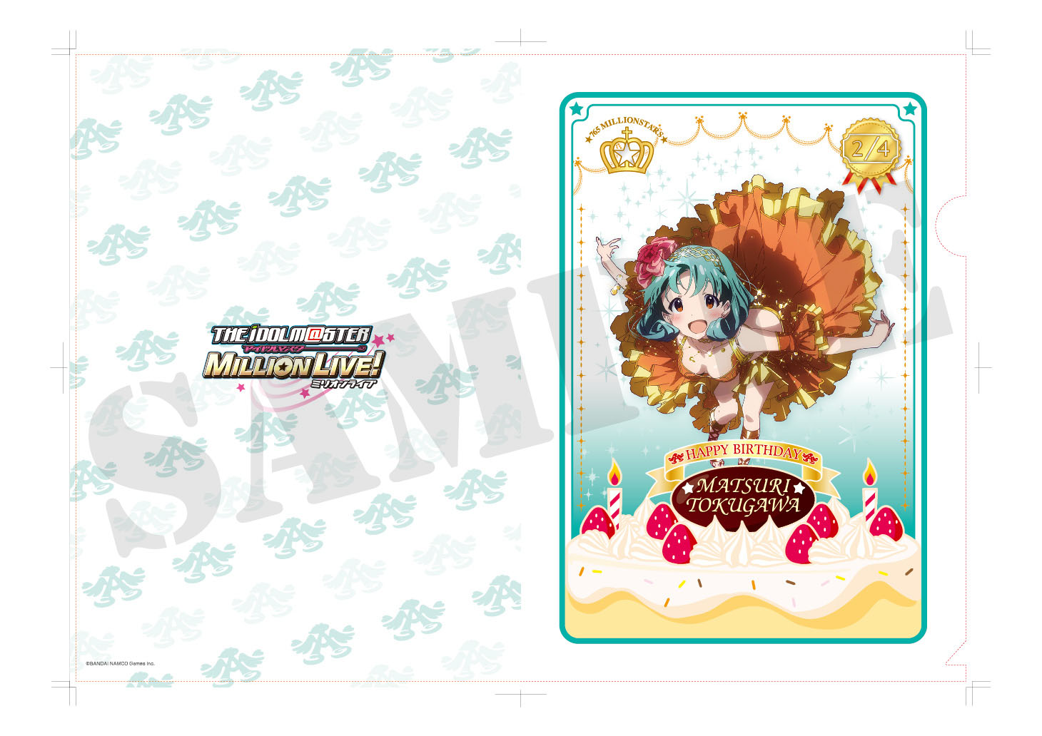 アイドル達のイラストはTVアニメ「THE IDOLM@STER」・劇場版「THE IDOLM@STER 輝きの向こう側へ!」制作のA-1 Picturesがゲームのために描き下ろしたものを使用。フレームにそれぞれのキャラクターのイメージカラーとバースデーケーキを加え、誕生日を迎えるアイドル達を豪華に、そして可愛くアレンジしたデザインのクリアファイルとなっています。第8弾として、2月が誕生日である「徳川まつり」「横山奈緒」「箱崎星梨花」「如月千早」のクリアファイルを2015年2月1日より発売予定です。