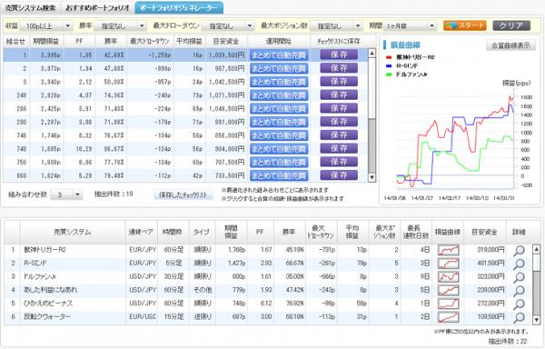 「ポートフォリオジェネレーター」は、その100種類以上の中から3つの売買システムの組合せた最適なポートフォリオをワンクリックで瞬時に生成します。