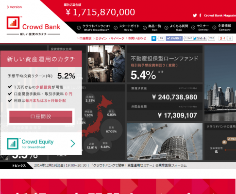 クラウドバンクとは、日本クラウド証券の運営する融資型クラウドファンディングサービス。ネットを通じて集めた小口資金を集約することで大口化し、事業資金ニーズのある企業や団体に融資をおこない返済金利の一部をユーザーに還元する。過去の実績利回りは5.6%。運用期間を半年から1年と設定しているファンドが多く投資初心者にも取り組みやい設定となっている。