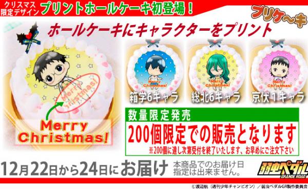 クリスマスデザインのホールケーキは初登場で緊急発売の為どうしても製造数に限りがございます。そのため「弱虫ペダルGRANDE ROAD」だけの限定販売&200個限定での販売となります。