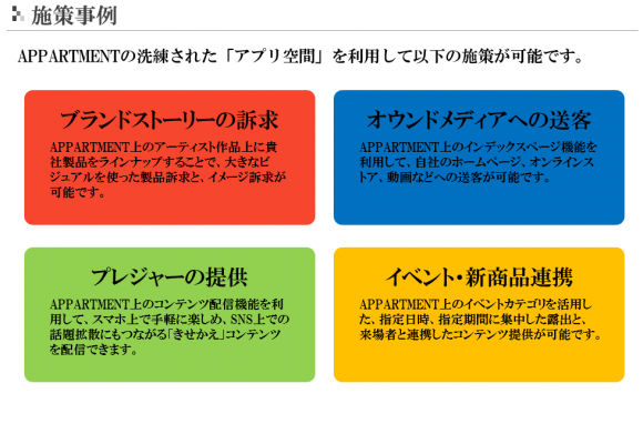 今年7月のアプリリリース以来、エンターテイメントの最前線で活躍するアーティストの商品を厳選して展開してまいりましたが、この度、APPARTMENTが持つ洗練されたアプリ空間と、エンターテイメントシーンを代表するアーティストやクリエイターとの企画制作ノウハウを活用した法人向けブランディングソリューションの提供を開始致しました。ソリューションの主な特徴は以下となります。