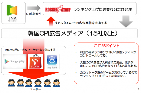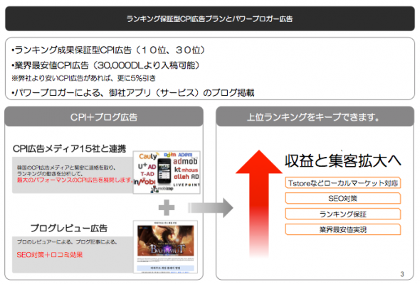 韓国のスマートフォンゲーム市場は、2014年に2,150億円を超え、アジアでは、NO.3の大きなマーケットまで成長しています。マーケットが大きいこともあり、大手からベンチャー企業まで、数多くのゲーム会社がスマートフォンゲーム市場に参入し、非常に競争が激しくなっております。また韓国は日本とプロモーション方法も異なるため、日本でのプロモーション方法では望ましい成果に繋がりにくいのが現状です。弊社では韓国企業との提携を強みとして、180万円(税別)でApp Storeランキング10位保証型プランを含む、韓国プロモーションパッケージを提供いたします。韓国のゲームメーカーが行うプロモーションを、日本でも行えるようにいたしました。