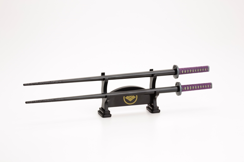 坂本龍馬は愛刀「陸奥守吉行」をモチーフにしつつ、鍔は実際寺子屋事件の際に持っていた刀についていたと言われる「唐獅子牡丹鍔」を元に造型、高杉晋作は愛刀「安芸国佐伯荘藤原貞安」をモチーフに鍔などの部分のデザインにこだわり造型しました。新シリーズ“侍箸”の特徴として、各お箸には「刀台」をイメージした家紋入の箸置き(坂本龍馬:「組み合わせ角に桔梗」紋/高杉晋作:「丸に割り菱」紋)が付属。そして、箸先には新しく滑り止め加工が施され、より使いやすくなっております。歴史ファンにはたまらない、プレゼントやお土産にも最適な逸品です。試合やテストなど勝負の日には連戦連勝を願って、より使い易くなった“侍箸“で美味しくご飯を召し上がってはいかがですか。