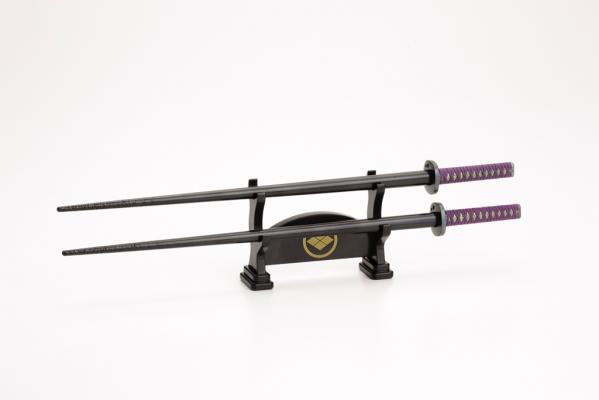 坂本龍馬は愛刀「陸奥守吉行」をモチーフにしつつ、鍔は実際寺子屋事件の際に持っていた刀についていたと言われる「唐獅子牡丹鍔」を元に造型、高杉晋作は愛刀「安芸国佐伯荘藤原貞安」をモチーフに鍔などの部分のデザインにこだわり造型しました。新シリーズ“侍箸”の特徴として、各お箸には「刀台」をイメージした家紋入の箸置き(坂本龍馬:「組み合わせ角に桔梗」紋/高杉晋作:「丸に割り菱」紋)が付属。そして、箸先には新しく滑り止め加工が施され、より使いやすくなっております。歴史ファンにはたまらない、プレゼントやお土産にも最適な逸品です。試合やテストなど勝負の日には連戦連勝を願って、より使い易くなった“侍箸“で美味しくご飯を召し上がってはいかがですか。