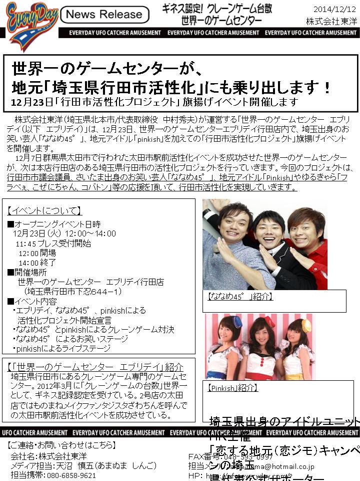 株式会社東洋(埼玉県北本市/代表取締役 中村秀夫)が運営する「世界一のゲームセンター エブリデイ(以下 エブリデイ)」は、12月23日、世界一のゲームセンターエブリデイ行田店内で、埼玉出身のお笑い芸人「ななめ45°」、地元アイドル「pinkish」を加えての「行田市活性化プロジェクト」旗揚げイベントを開催します。