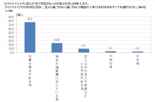 クリスマスイブに恋人と「会う予定はない」と答えた男女に対して、恋人と過ごせない(過ごさない)理由を尋ねたところ、76.2%の男女が「仕事の都合がある為」と回答した。次いで23.8%が「相手が遠距離に住んでいる為」と 回答した。今年のクリスマスイブは、会いたくてもあえないカップルが多いことが伺える。