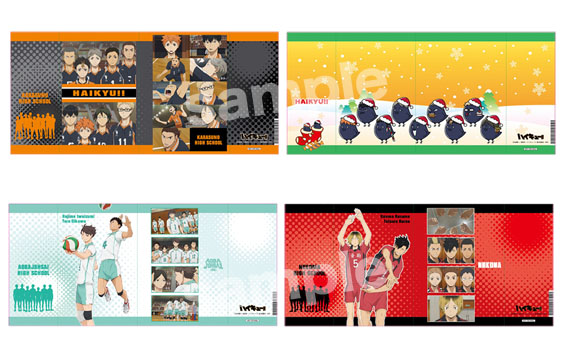 2014年12月11日(木)~2015年1月12日(月・祝)の期間中、関連商品をご購入・ご予約いただいたお客様に【特製ブックカバー】をプレゼント! 烏野高校、青葉城西高校、音駒高校のアニメの感動シーンが描かれた3絵柄と、サンタ帽をかぶったヒナガラスが描かれたかわいい絵柄の計4種類からランダムでプレゼント!
