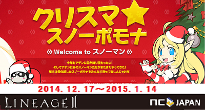 PC向けオンラインゲーム『リネージュ2~Epic Tale of Aden~(以下、『リネージュ2』)』をサービス、運営しているエヌ・シー・ジャパン株式会社(東京都渋谷区、代表取締役:金 澤憲(キム テクホン))は、2014年12月17日(水)定期メンテナンス終了後から2015年1月14日(水)定期メンテナンス開始前までの期間「クリスマ スノーポモナ」を実施いたします。