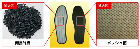 その為、株式会社 ロックウォーターでは、日干しなどを行うと吸着していたものを放出する特性があり、活性炭には含まれない活性ケイ酸という強い抗菌力をもつ物質を含んでいる竹炭で靴の中敷(インソール)の開発を行いました。