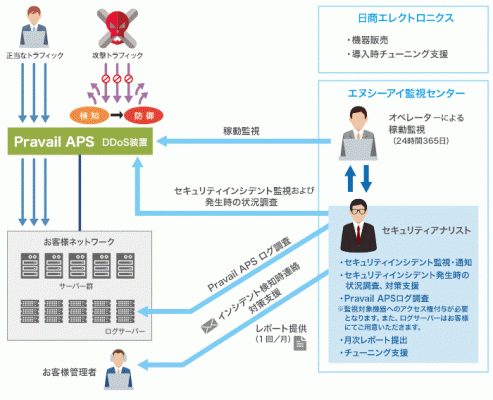今回エヌシーアイは、DDoS攻撃対策であるArbor Networks社Pravail APS向けのMSSを国内で初めて提供します。日商エレよりシステム導入の支援を行い、エヌシーアイのSOCからお客様のシステムに設置したPravail APSを監視することで、お客様のネットワークに対する脅威の検知、解析および影響調査を行ってサービスの可用性を確保し、サイバーセキュリティ脅威からお客様のシステムを守ります。