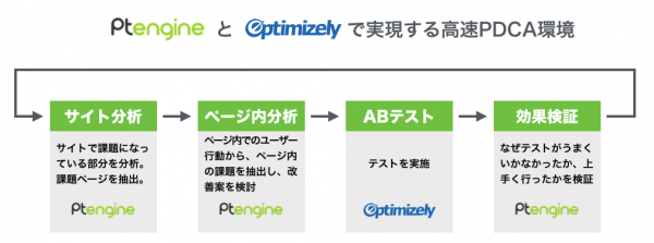 このシステム連携により、OptimizelyでのABテストの内容とPt engineのヒートマップが紐づいて利用ができるようになりました。これにより、Pt engineのヒートマップを元に課題抽出・仮説構築を行い、その内容に基づいてOptimizelyでABテストを行い、結果をまたヒートマップで評価するという、サイト改善のPDCAが高速で回せるようになります。