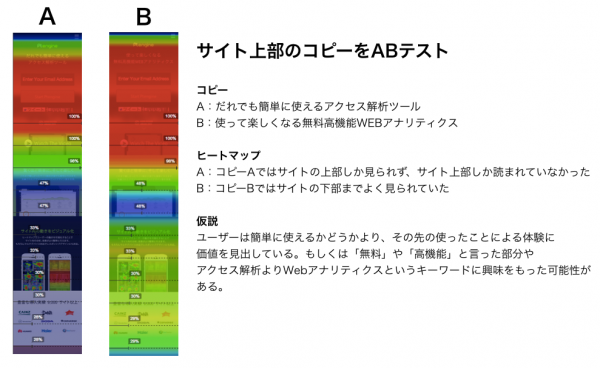 コピーがAとBで異なるものをOptimizelyで用意し、ユーザーに実際にアクセスしてもらいユーザーの行動にどのような変化が起こるかを検証しました。システム連携によりコピーAでのヒートマップとコピーBでのヒートマップ、それぞれが閲覧できるようになっています。