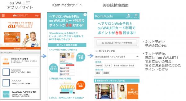今回の業務提携により、auをご利用のお客さま(注2)が、「KamiMado」を利用して予約(注3)を行うと、予約金額の1%分の「WALLET ポイント」が貯まります。また、「KamiMado」に掲載中の美容院のうち、au WALLETの「ポイントアップ店」では、「au WALLET」でお支払いただくと、決済金額に応じて「WALLET ポイント」が通常店舗よりもおトクに貯まります(注4)。