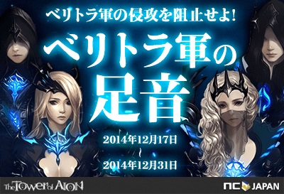 PC向けオンラインゲーム『The Tower of AION(以下、タワー オブ アイオン)』をサービス、運営するエヌ・シー・ジャパン株式会社(東京都渋谷区、代表取締役:金 澤憲(キム テクホン))は、2014年12月17日(水)定期メンテナンス終了後から2014年12月31日(水)午後11時59分までの期間「ベリトラ軍の足音」を実施いたします。