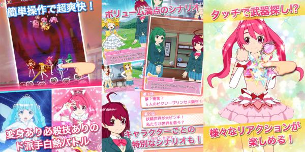 バトルはキャラクターをタップするだけの簡単操作。連続タップでコンボを増やし、大ダメージを与えます。変身シーンと必殺技はムービーで表現。それ以外にも様々なアクション、カットインでの感情表現、コスチュームチェンジなど、バトルをド派手に盛り上げる要素が盛りだくさんです。少女たちの頑張る姿と、爽快・白熱のバトルを存分にお楽しみいただけます。