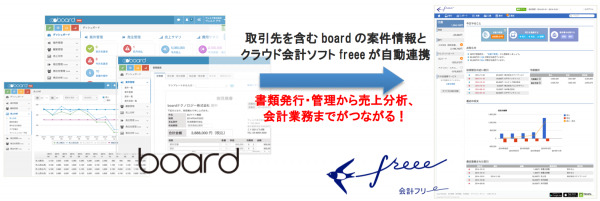 今回のboardとクラウド会計ソフトfreeeの連携により、必要な見積書、請求書等の書類発行、案件管理、発注管理から売上分析、そして会計業務まで、受託ビジネスにおける一連の業務の流れに一貫して対応する業務システムをクラウド上で実現しました。