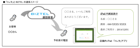 株式会社リンク( 本社:東京都港区、代表取締役社長:岡田 元治 )のクラウド型テレフォニーサービス「BIZTEL(ビズテル)」と、株式会社トレタ(本社:東京都渋谷区、代表取締役:中村 仁)が提供する予約台帳アプリ「 トレタ 」の機能連係を2015年1月より開始いたします。