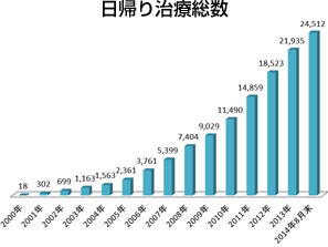 今では世界中から治療に訪れ、現在まで25,196件(14年10月末時点)の日帰り治療を成功させてきました。
