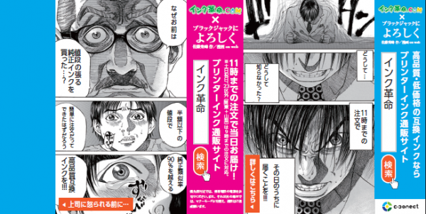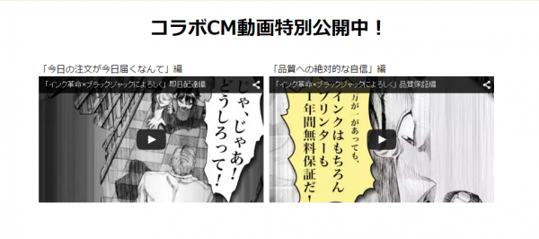 これに先駆けて、2014年12月16日、インク革命.COMは「インク革命×ブラックジャックによろしく」 スペシャルコラボサイトをオープンしました。「ブラックジャックによろしく」の漫画と一緒にインク革命の互換インク・トナーカートリッジの品質についてや当日配達などについて解りやすく解説しています。「今日の注文が今日届くなんて」編や、「品質への絶対的な自信」編など、サイト限定の漫画を公開し、インク革命.COMならではのサービスも紹介しています。更に、こちらの漫画を基にした限定CMもサイト内で公開中です。