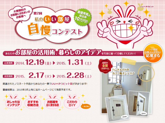 本コンテストは、当社グループで管理する賃貸住宅(2014年11月末時点84.3万戸)にお住まいの入居者様を対象に、お部屋づくりの工夫や活用術を紹介していただくコンテストで、今年で2回目の開催です。