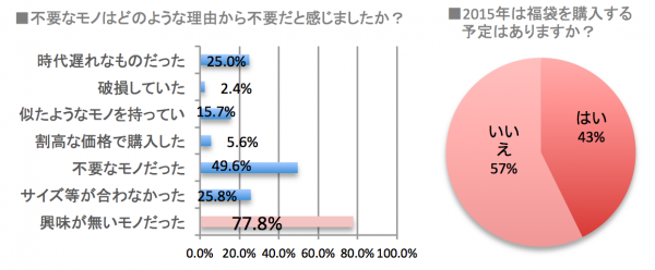 また、続けて2015年に福袋を購入する予定があるかを質問したところ「はい」と回答した方は43%(n=133)になり、今シーズンも多くの女性が不要な物が含まれているのを承知で購入します。