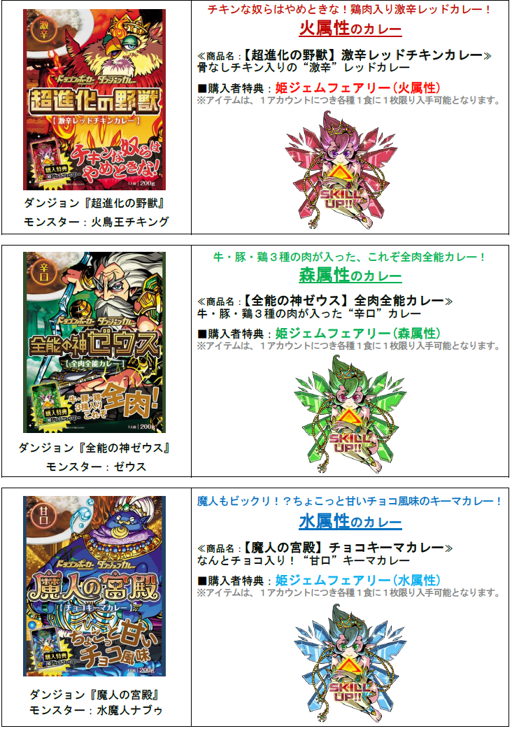 3種類のカレーの味は、ゲーム内のダンジョンをモチーフに、こだわりぬいた具材を使用した本格