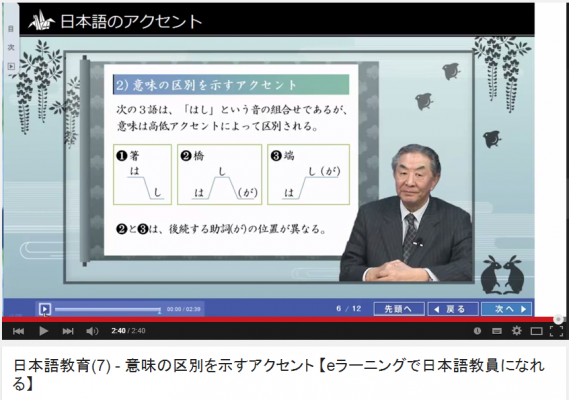 本科目のeラーニングは、日本語教育の歴史から、基本的な日本語学の知識、異文化コミュニケーションなど、日本語教育の基礎を動画でわかりやすく学ぶ構成となっています。YouTube動画においては、日本語の「省略」「文脈依存」「アクセント」など、日本語の特質に関する基礎を、わかりやすく、そして楽しく学ぶことができます。