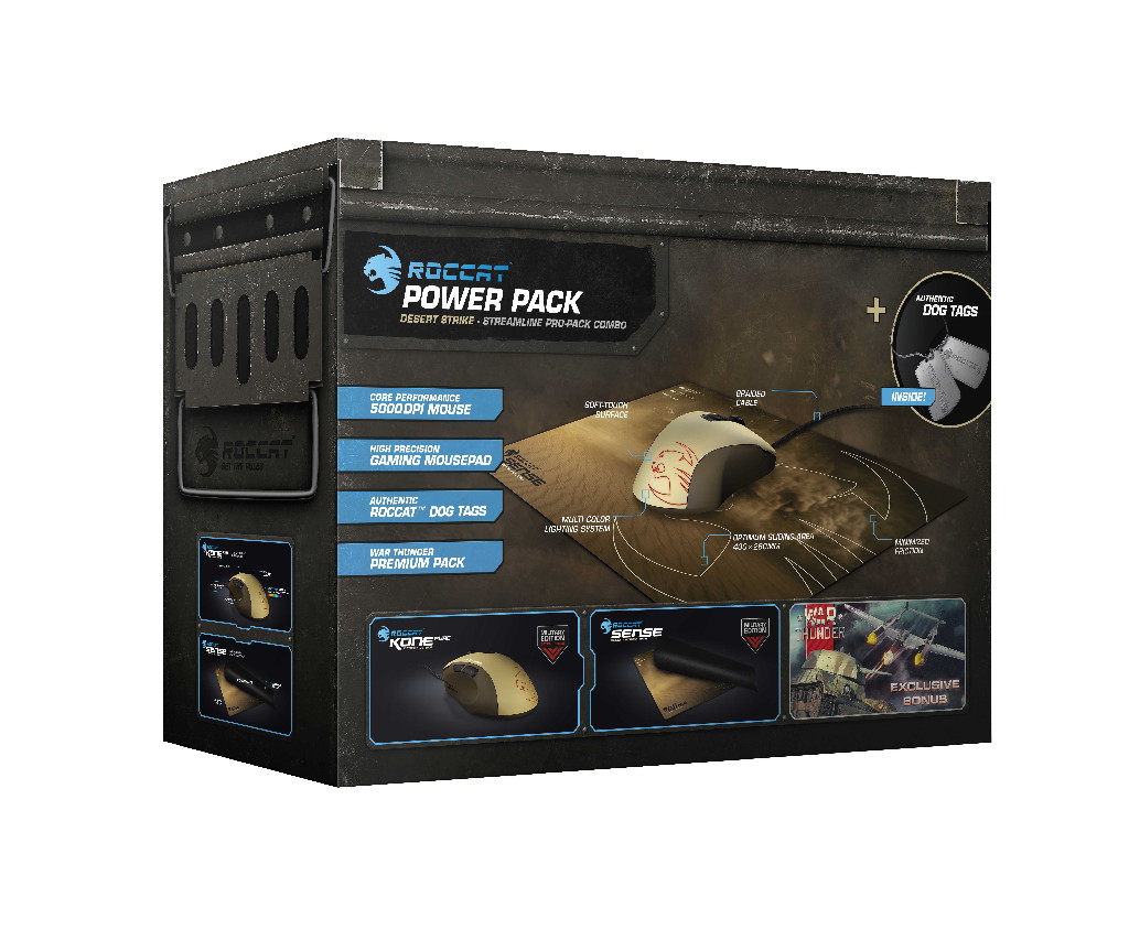 「ROCCAT Power Pack」は、弾薬入れをイメージした製品ボックスに、光学センサー搭載マウスの「Kone Pure Military」と、マウスパッド「Sense Military」をセットにし、スペシャルプレゼントとしてROCCATオリジナルのドッグタグと、限定ボーナスとしてMMOコンバットゲーム「War Thunder」の25ドル分のボーナスパックを同梱したもの。パッケージは、砂漠における戦闘をイメージした「Desert Strike」、海上戦をイメージした「Naval Storm」、ジャングルにおける戦闘をイメージした「Camo Charge」の3種類が用意され、それぞれのイメージと同じカラースキームを採用したKone Pure MilitaryとSense Militaryが収められている。なお、「ROCCAT Power Pack」の市場想定価格は12,800円(税抜)。