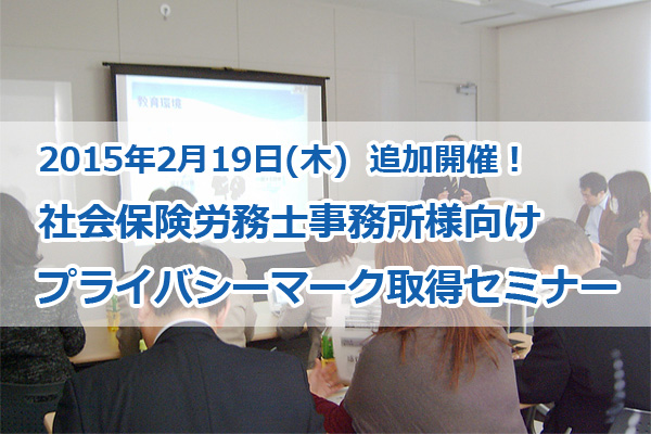 2013年の5月24日に「共通番号(マイナンバー)法」が成立し、2015年10月から、市町村が住民に個人番号を記載した、「通知カード」を事前に郵送して知らせ、2016年1月からは番号情報が入ったICチップを埋め込んだ顔写真付きの「個人番号カード」が市町村の窓口で公布されます。民間企業では、従業員の健康保険や厚生年金の加入手続を行ったり、従業員の給料から源泉徴収して税金を納めたりしています。また、証券会社や保険会社等の金融機関でも、利金・配当金・保険金等の税務処理を行っています。2016年1月以降は、これらの手続を行うためにマイナンバーが必要となります。これらの業務を踏まえ、マイナンバー法には「個人番号関係事務の全部又は一部の委託をする者は、委託先において、番号法に基づき委託者自らが果たすべき安全管理措置と同等の措置が講じられるよう必要かつ適切な監督を行わなければならない」と規定に定められています。社労士事務所様(委託先)が企業に信頼性と安全性の証明に社会的に信用度が高い「プライバシーマーク」を取得している社労士事務所であることを示すことは、非常に効果的で有効な方法です。マイナンバー制度開始の前にプライバシーマークを取得されようとする社労士事務所様向けに2015年1月22日(木)に「プライバシーマーク取得(無料)セミナー」を開催しますが、既に好評満席の為2015年2月19日(木)に追加開催したします。
