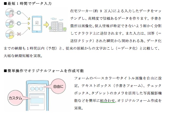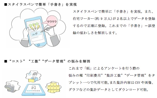 KAMIMAGE(カミメージ)は、裏側で控えております約9万人の在宅ワーカーが手書き文字を入力してデータ化する仕組みを搭載し、これら先行したサービスの問題点を改善することに成功致しました。また、「紙」ではなく「タブレット」を用いることで、設問の加筆修正も容易に、デザイン性の自由度も高く、カメラを使ってユーザーの提出書類の撮影・添付書類とすることができるなど、タブレット特有の利用方法が有利に実現できます。※もちろん、撮影した添付書類(例えば名刺)も手入力によるデータ化が可能