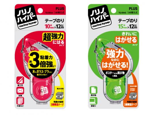 いずれも紙類だけでなく木板や樹脂、ガラス、プラスチックなども接着できるため、事務作業はもちろん、サンプル作成、ガラス面へのポスター掲示など幅広い作業に使用でき、従来の「テープのり」の用途を大幅に広げる“ハイパー”なテープのりです。
