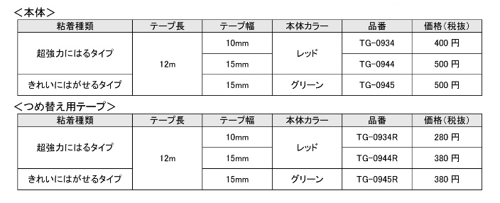「超強力にはるタイプ」のテープ幅は10mmと15mmの2種類で本体カラーはレッド、「きれいにはがせるタイプ」のテープ幅は15mmで本体カラーはグリーンです。また、テープつめ替え式なので経済的です。