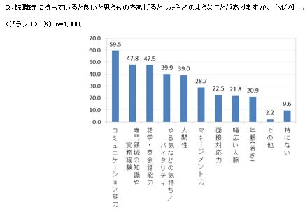 1、転職時に持っていると良いと思うものは、「コミュニケーション能力」59.5%、