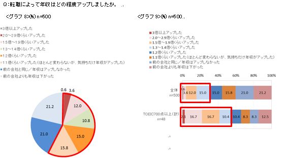 5. 英語力が高い人(TOEICスコア700点以上)は、60.4%が年収1.3倍以上アップ