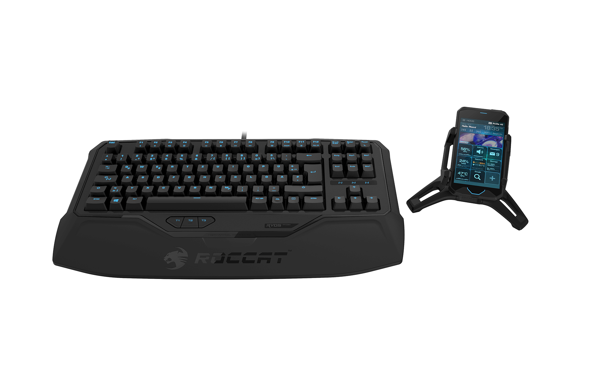ROCCATの創業者兼CEOのRené Korteは、「われわれは強いビジョンとともにPhoboのコンセプトを打ち立てました」と説明。「われわれは、同コンセプトの機能とデザインを完璧なものにすべく、設計図を書き直すところまで立ち戻ることにしました」と、Ryos Phobo開発の背景を振り返ります。Ryos Phoboにはさまざまな変更が加えられましたが、“すばらしいゲーミングキーボードとスマートフォンのテクノロジを融合させることで、ソフトウェアを介してゲームに驚異的な馬力を注入する”という肝心のコンセプトはそのまま継承しています。Ryos Phoboでは、スマートフォンのメーカーやサイズにかかわらず、無線で「Ipuri」と接続したり、二つのBluetoothチャンネルを介して接続することができます。ゲーマーは、スマートフォンを好きな位置に置いて、カスタムキーとして使ったり、ステータスをチェックしたりと、自分に最適なゲームプレイ環境を作ることができます。キーにはCherry MXメカニカルスイッチを採用し、2つのUSBポートを備えるとともに、10キーを省いたコンパクトなデザインを実現しています。また、Ryos PhoboにはあたらしいSwarmドライバソフトウェアを統合しています。さらに、ROCCATでは、メカニカルキーボードのラインナップを拡充し、Cherry MXスイッチとRGB LEDを搭載した「Ryos MK FX」と「Ryos TKL FX」も公開する予定です。