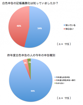平成 26 年度より白色申告者全員に記帳が義務化され、白色申告者にとっては負担増となる今年の確定申告ですが、この記帳義務化について知っている白色申告予定者は、54% にとどまることが本調査より明らかになりました。