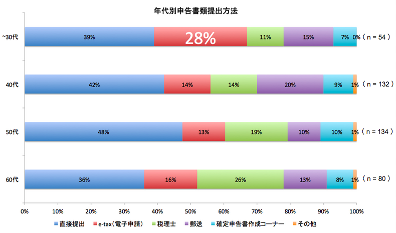 一方、税理士などに申告を依頼する代理申告は年代が高くなるに連れて利用率が高くなる、という傾向になっています。