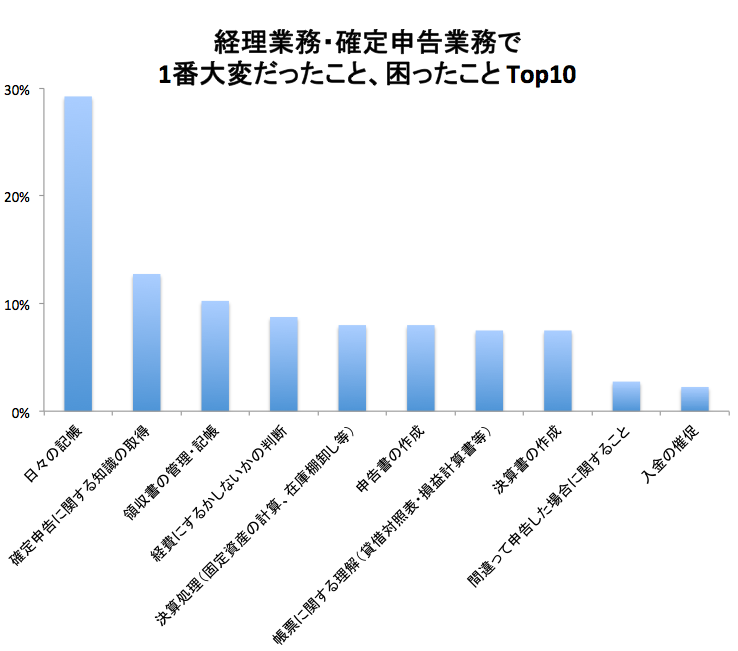 確定申告や経理業務で1番大変なことは「日々の記帳」「確定申告に関する知識の取得」の順となり、普段の記帳などの実作業に加えて、確定申告特有の知識を得るのに苦労していることがわかりました。