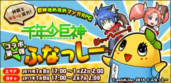 株式会社enish(本社:東京都港区、代表取締役社長:安徳 孝平、以下「エニッシュ」)は、現在iOS及びAndroid端末向けにサービス中の巨神攻め攻めマンガRPG『千年の巨神』にて、船橋市非公認ご当地キャラ『ふなっしー』とのコラボイベントを開催いたします。