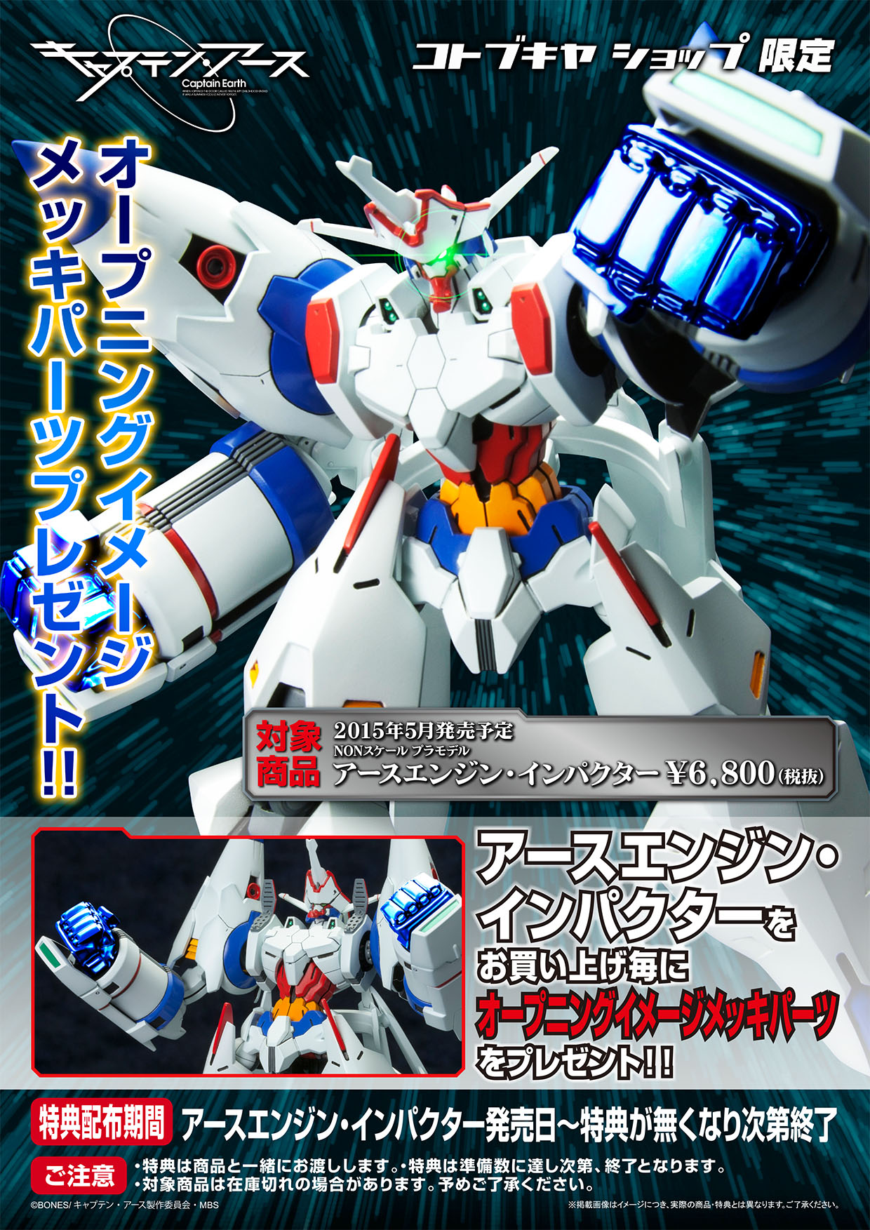 ホビーメーカー株式会社壽屋(本社:東京都立川市曙町/代表:清水一行)は、2014年に放送されたTVアニメ『キャプテン・アース』に登場した主役ロボット「アースエンジン・インパクター」のプラモデルを、業界最速で商品化し、2015年5月に発売します。