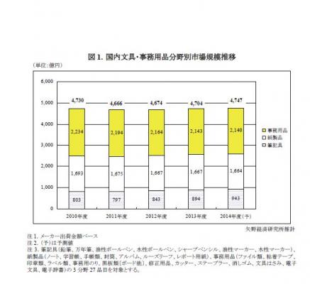 ◆ 2013年度の国内文具・事務用品市場は前年度比0.6%増の4,704億円と推計
