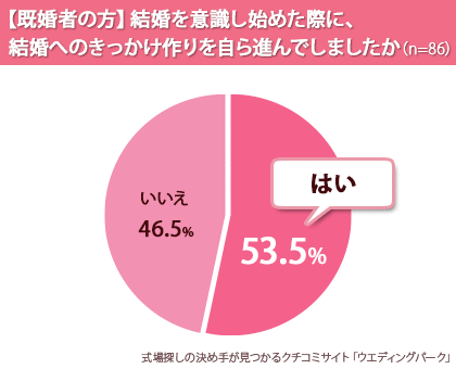 調査結果では『結婚を意識し始めた際に、結婚へのきっかけ作りを自ら進んでしましたか(単一選択)』という質問をしたところ、既婚女性の53.5%が「はい」と回答。既婚女性の2人に1人以上が「同棲開始」「両親に紹介」「子作りの話から始めた」等、結婚への具体的なきっかけ作りを自ら進んでしていた事がわかりました。