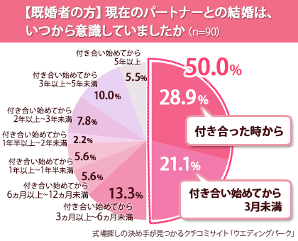 『現在のパートナーとの結婚は、いつから意識していましたか(単一選択)』という質問では、「付き合った時から(28.9%)」「付き合い始めてから3カ月未満(21.1%)」という回答があり、既婚女性の50%以上が「付き合って3カ月未満」で未来の夫を見極めていた事がわかりました。